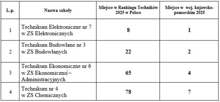 (65 miejsce w Rankingu Techników 2026 w Polsce, 121 miejsce w Rankingu Maturalnym Techników w Polsce, 4 miejsce w Rankingu Techników w woj. kujawsko-pomorskim),
