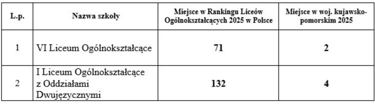 (132 miejsce w Rankingu Liceów Ogólnokształcących 2026 w Polsce, 133 miejsce w Rankingu Maturalnym Liceów, 4 miejsce w Rankingu Liceów w woj. kujawsko-pomorskim).