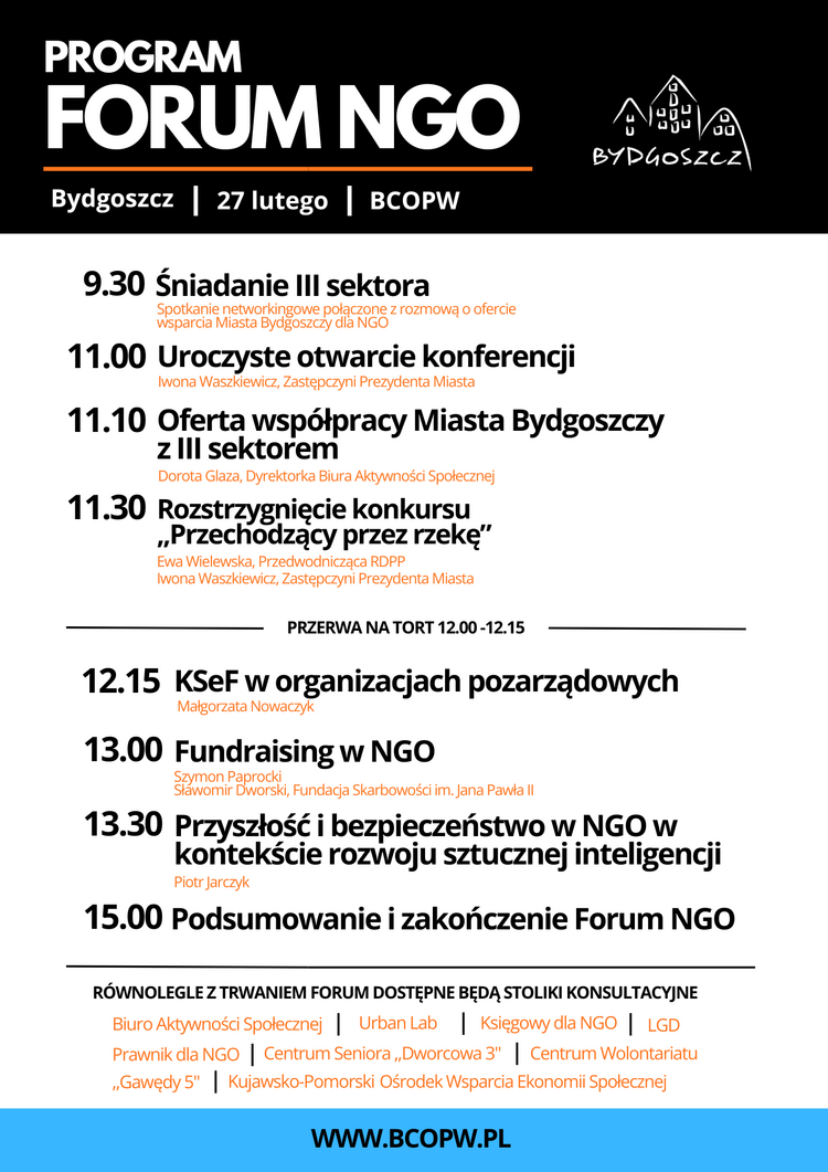 Odbywające się w piątek, 27 lutego forum rozpocznie się od „Śniadania III sektora” (godz. 9.00) połączonego z rozmową o ofercie wsparcia, jako Miasto Bydgoszcz kieruje do organizacji pozarządowych. Później wśród poruszanych tematów będą m.in. „KSeF w organizacjach – praktyczne wyzwania i przygotowanie”, „Fundraising w NGO”, czy „AI, przyszłość i bezpieczeństwo NGO”. Nie zabraknie również urodzinowego tortu z okazji Światowego Dnia Organizacji Pozarządowych.