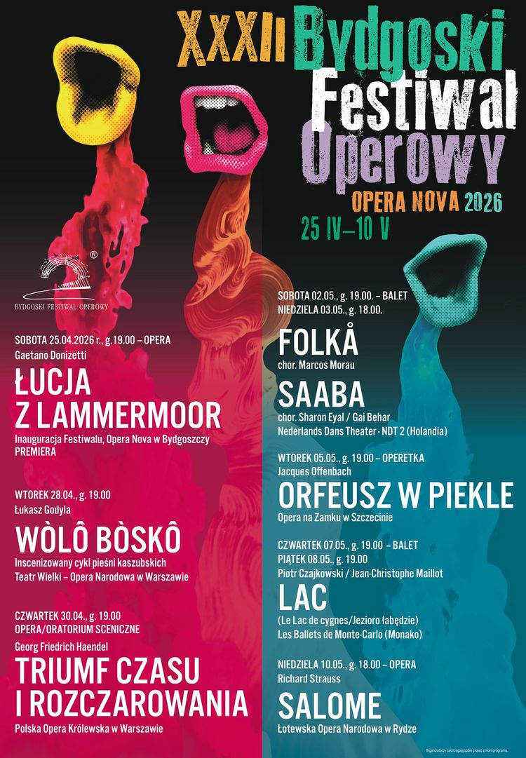 Plakat zapowiadający XXXII BFO stworzony przez wybitnego artystę Jacka Staniszewskiego, przedstawia trzy barwne formy – swoistą kontynuację festiwalowej „sprężynki”, znanej melomanom z poprzedniej edycji jako Novadonna (imię nadane przez facebookowiczów). - Opera nie musi być prezentowana w sposób tradycyjny. Skoro współczesne teatry korzystają z multimediów, projekcji i ruchomych scenografii, także plakat powinien być otwarty na nowe formy – podkreśla artysta. Ta idea doskonale oddaje charakter tegorocznego Festiwalu – otwartego na różnorodność i nowoczesność, przy zachowaniu najwyższych artystycznych standardów. XXXII BFO potrwa od 25 kwietnia do 10 maja 2026 r. Szczegółowe informacje dostępne są TUTAJ.