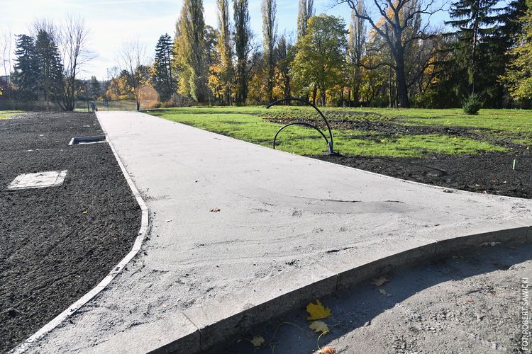 Powstała nowa główna alejka poprowadzona w osi parku, otwierająca całą przestrzeń z widokiem na jego centralną część. Wprowadziliśmy oświetlenie parkowe, monitoring oraz montaż elementów małej architektury nawiązujących stylem do pozostałych. Zasadziliśmy dodatkowe drzew i krzewy. Podkreślone zostało reprezentacyjne wejścia do parku od strony ul. Markwarta. Zakres zadania uwzględnia też takie elementy jak stworzenie punktów edukacyjnych związanych ze środowiskiem (np. żywopłoty jako ekrany akustyczne) oraz przeprowadzonymi w ostatnich latach badaniami archeologicznymi (upamiętnimy m.in. pochowaną na dawnym cmentarzu sanitariuszkę ratującą żołnierzy w czasie XIX-wiecznych wojen).