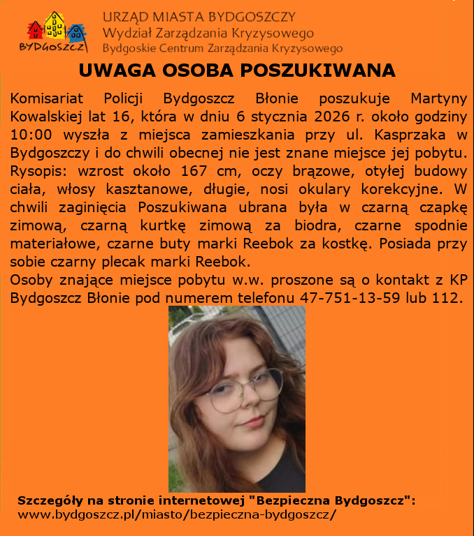 - Komisariat Policji Bydgoszcz Błonie poszukuje Martyny Kowalskiej lat 16, która w dniu 6 stycznia 2026 r. około godziny 10:00 wyszła z miejsca zamieszkania przy ul. Kasprzaka w Bydgoszczy i do chwili obecnej nie jest znane miejsce jej pobytu. Rysopis: wzrost około 167 cm, oczy brązowe, otyłej budowy ciała, włosy kasztanowe, długie, nosi okulary korekcyjne. W chwili zaginięcia Poszukiwana ubrana była w czarną czapkę zimową, czarną kurtkę zimową za biodra, czarne spodnie materiałowe, czarne buty marki Reebok za kostkę. Posiada przy sobie czarny plecak marki Reebok.