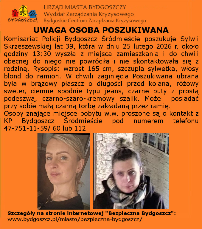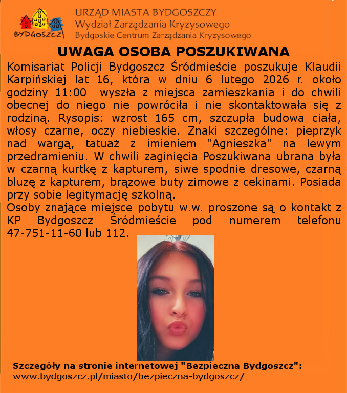 - Komisariat Policji Bydgoszcz Śródmieście poszukuje Klaudii Karpińskiej lat 16, która w dniu 6 lutego 2026 r. około godziny 11:00 wyszła z miejsca zamieszkania i do chwili obecnej do niego nie powróciła i nie skontaktowała się z rodziną. Rysopis: wzrost 165 cm, szczupła budowa ciała, włosy czarne, oczy niebieskie. Znaki szczególne: pieprzyk nad wargą, tatuaż z imieniem "Agnieszka" na lewym przedramieniu. W chwili zaginięcia Poszukiwana ubrana była w czarną kurtkę z kapturem, siwe spodnie dresowe, czarną bluzę z kapturem, brązowe buty zimowe z cekinami. Posiada przy sobie legitymację szkolną.