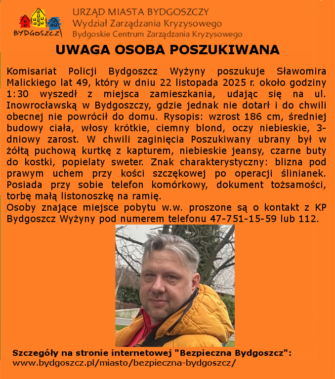 - Komisariat Policji Bydgoszcz Wyżyny poszukuje Sławomira Malickiego lat 49, który w dniu 22 listopada 2025 r. około godziny 1:30 wyszedł z miejsca zamieszkania, udając się na ul. Inowrocławską w Bydgoszczy, gdzie jednak nie dotarł i do chwili obecnej nie powrócił do domu. Rysopis: wzrost 186 cm, średniej budowy ciała, włosy krótkie, ciemny blond, oczy niebieskie, 3-dniowy zarost. W chwili zaginięcia Poszukiwany ubrany był w żółtą puchową kurtkę z kapturem, niebieskie jeansy, czarne buty do kostki, popielaty sweter. Znak charakterystyczny: blizna pod prawym uchem przy kości szczękowej po operacji ślinianek. Posiada przy sobie telefon komórkowy, dokument tożsamości, torbę małą listonoszkę na ramię.