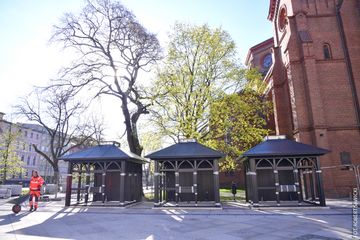 Trwa przebudowa jezdni wzdłuż kamienic. Dawny postój taksówek zmienił się w ogród. Rozpoczął się montaż wcześniej wykonanych konstrukcji pawilonów...