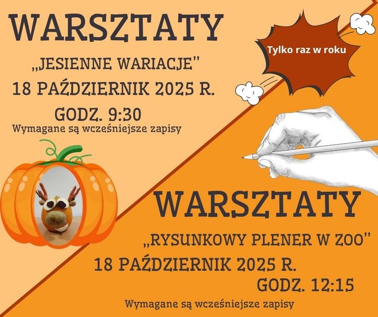 Również w sobotę, 18 października o godz. 12:15 organizatorzy zapraszają na wyjątkowe warsztaty pt. „Rysunkowy plener w zoo”.  To niezwykła okazja, by połączyć pasję do rysowania z fascynacją światem zwierząt. Pod okiem artystek Pauliny Krajewskiej i Klaudii Wiśniewskiej uczestnicy poznają wybranych mieszkańców zoo i nauczą się uchwycić ich charakter na papierze. Warsztaty odbędą się w plenerze, wśród zwierząt i natury – idealnych inspiracji dla każdego artysty, zarówno początkującego, jak i doświadczonego. Przyjdź, rozwiń swoją wyobraźnię i stwórz wyjątkowy rysunek inspirowany prawdziwym światem zwierząt.