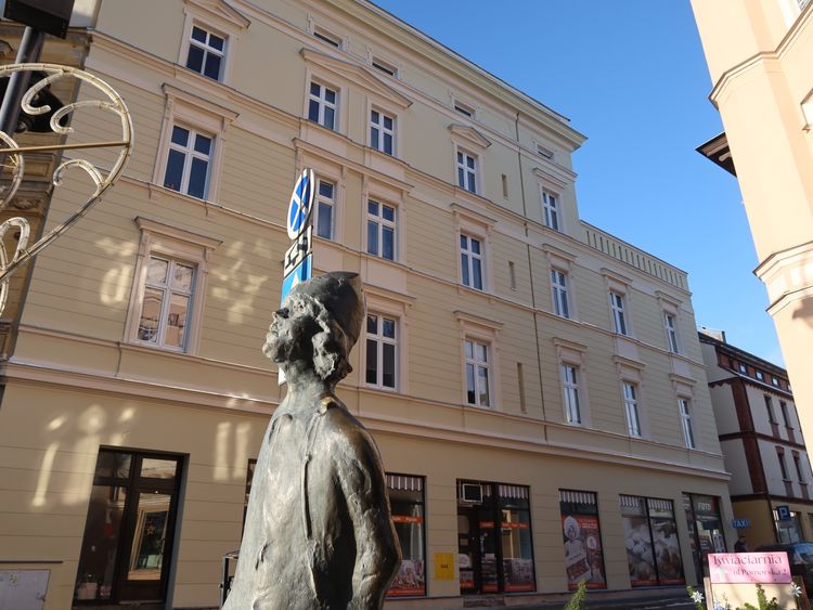 Budynek powstał w 1884 roku według projektu Alberta Rosa. W 1908 roku otwarto tam aptekę prowadzoną przez dr Aurela Kratza, która sprzedawała również elementy do aparatów fotograficznych. W kamienicy od początku XX wieku funkcjonował też gabinet dentystyczny. Charakterystycznym elementem są arkady. Co ciekawe, to rozwiązanie zrealizowano dopiero w latach 60. XX wieku. Podcienie w trakcie frontowym i narożniku pozwoliły na tym odcinku ulicy położyć dwa tory wraz z rozjazdami w obu kierunkach ul. Gdańskiej. Kamienica jest bogato zdobiona. Frontowa elewacja jest pełna gzymsów, płycin, lizenów (pionowych pasów), fryzów, naczółków. Na narożnej fasadzie znajduje się elegancki wykusz. Gzyms pod linią dachu zdobiony jest konsolami.