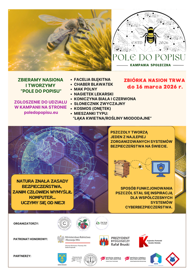 W dobie rosnącego znaczenia technologii cyfrowych, bezpieczeństwo w sieci staje się jednym z kluczowych wyzwań dla każdego z nas – niezależnie od wieku czy zawodu. Kampania edukacyjna POLE DO POPISU łączy świadomość cyberbezpieczeństwa z troską o przyrodę, pokazując, że nowoczesne systemy ochrony inspirowane są naturą – podobnie jak ul pszczeli, który działa w sposób zorganizowany, monitorując i reagując na zagrożenia. Projekt ma charakter edukacyjno-społeczny i promuje odpowiedzialne korzystanie z Internetu, jednocześnie zachęcając uczestników do tworzenia kwiatowych łąk. Dzięki temu kampania łączy naukę, ekologię i praktyczne działania, umożliwiając uczestnikom zdobywanie wiedzy w sposób kreatywny i angażujący.