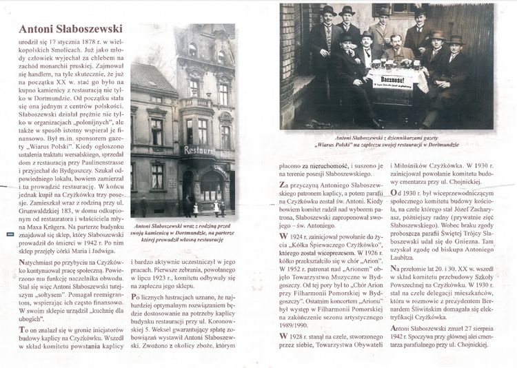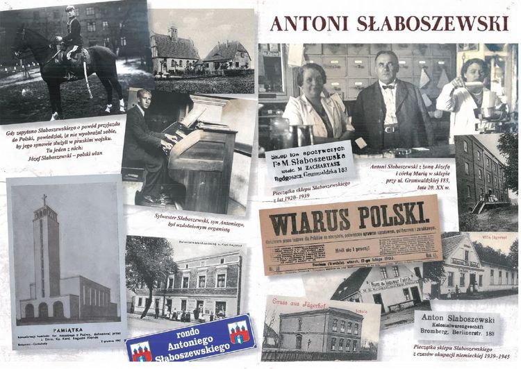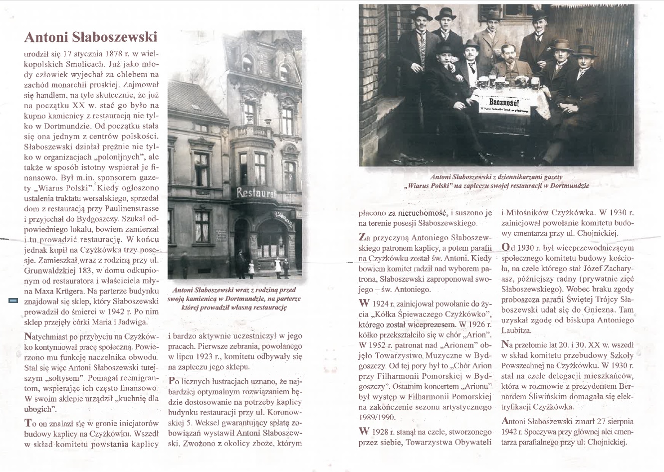 Antoni Słaboszewski żyjący w latach 1878–1942 był wybitnym działaczem społecznym, patriotą i liderem lokalnej społeczności na bydgoskim Czyżkówku. Po latach pracy i działalności na emigracji w Westfalii, gdzie prowadził restaurację będącą centrum życia polonijnego w Dortmundzie, powrócił do odradzającej się Polski. W 1919 roku osiedlił się w Bydgoszczy, gdzie nie tylko założył rodzinny sklep, ale z oddaniem zaangażował się w rozwój społeczny i religijny dzielnicy Czyżkówko. W styczniu 1920 roku powierzono mu funkcję Naczelnika Obwodu - lokalnego przywódcy, pełniącego rolę „sołtysa”. Pomagał repatriantom, wspierał potrzebujących, a w swoim sklepie urządził jadłodajnię dla najuboższych. Był współorganizatorem komitetu budowy kaplicy, a następnie kościoła na Czyżkówku, który powstał dzięki jego nieustępliwości, wsparciu finansowemu i zdolności do jednoczenia ludzi wokół wspólnego celu. A. Słaboszewski aktywnie uczestniczył również w życiu kulturalnym - współtworzył „Kółko Śpiewacze Czyżkówko”, a później chóry „Arion” i „Św. Cecylia”, które odgrywały istotną rolę w kształtowaniu tożsamości społeczności lokalnej. Był ich mecenasem, fundatorem sztandaru oraz członkiem zarządu. Angażował się także w działalność Stowarzyszenia Młodych Polek „Wiosna”, Chrześcijańskiej Demokracji oraz Towarzystwa Robotników Polsko-Katolickich. Jego życie i działalność to przykład bezinteresownego zaangażowania w sprawy społeczne, religijne i obywatelskie.