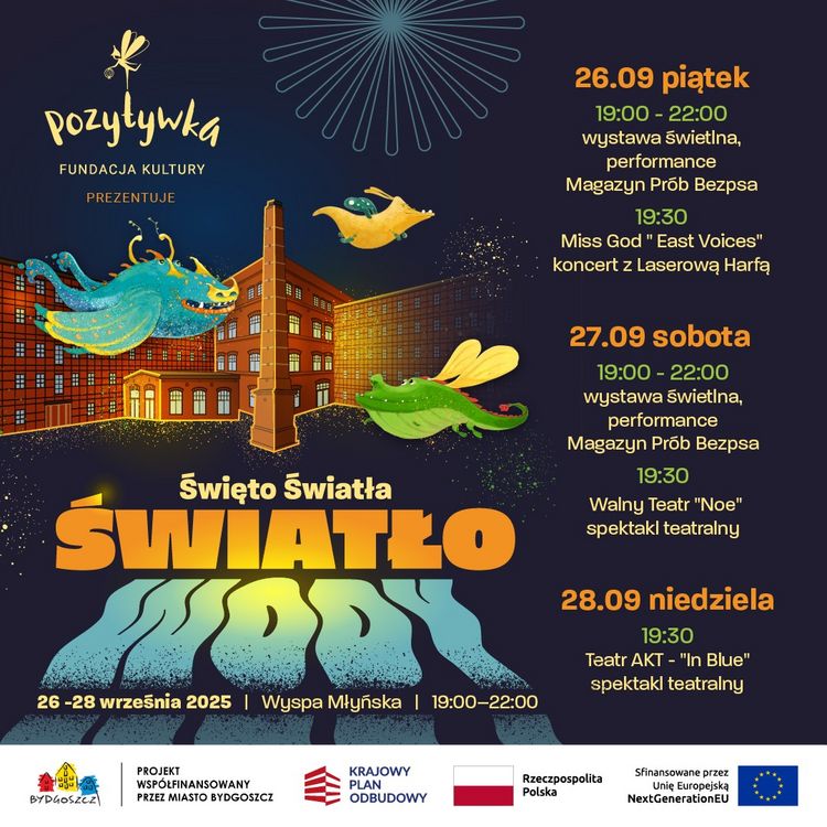Fundacja Kultury Pozytywka zaprasza na wyjątkowe wydarzenie artystyczne, które rozświetli Bydgoszcz w dniach 26–28 września (piątek – niedziela) w godz. 19:00 – 22:00. Przez trzy wieczory Wyspa Młyńska stanie się przestrzenią pełną światła, muzyki i teatru. To będzie wyjątkowa okazja, by zobaczyć artystów z Polski i zagranicy w nowoczesnych, widowiskowych formach.