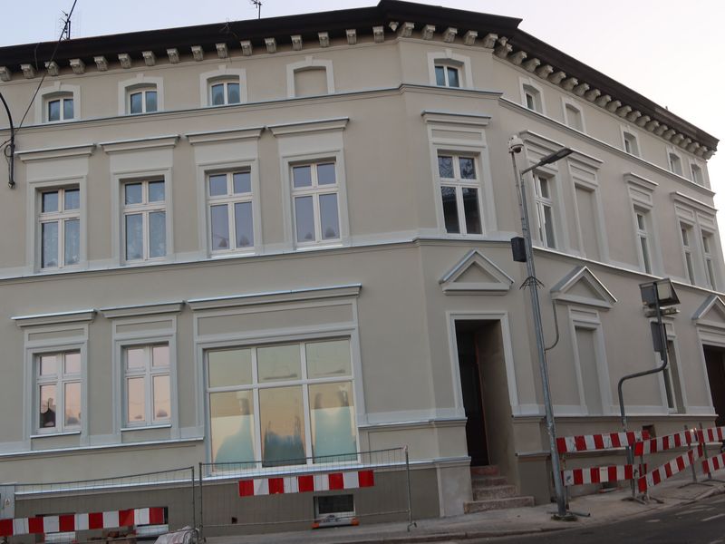 Kończą się też prace w narożnej kamienicy przy ul. I. Skorupki 1, która zamyka perspektywę ul. Podgórnej. Zrealizowano w niej przebudowę przegród zewnętrznych oraz remont elewacji frontowych. Kamienica powstała około 1890 roku na planie zbliżonym do litery L. Składa się z dwóch części: piętrowej, która zamyka perspektywę ul. Podgórnej oraz parterowej od strony ul. I. Skorupki. Parter zaadaptowany został na lokal usługowy. Elewacja odzyskała szereg pierwotnych zdobień takich jak gzymsy, naczółki, obramienia otworów okiennych i drzwiowych, konsole pod linią dachu. Budynek utrzymany jest teraz w beżowej kolorystyce. Prace zakończą się w ciągu miesiąca. Kosztują około 280 tysięcy złotych. Inwestorem jest komunalna spółka ADM.