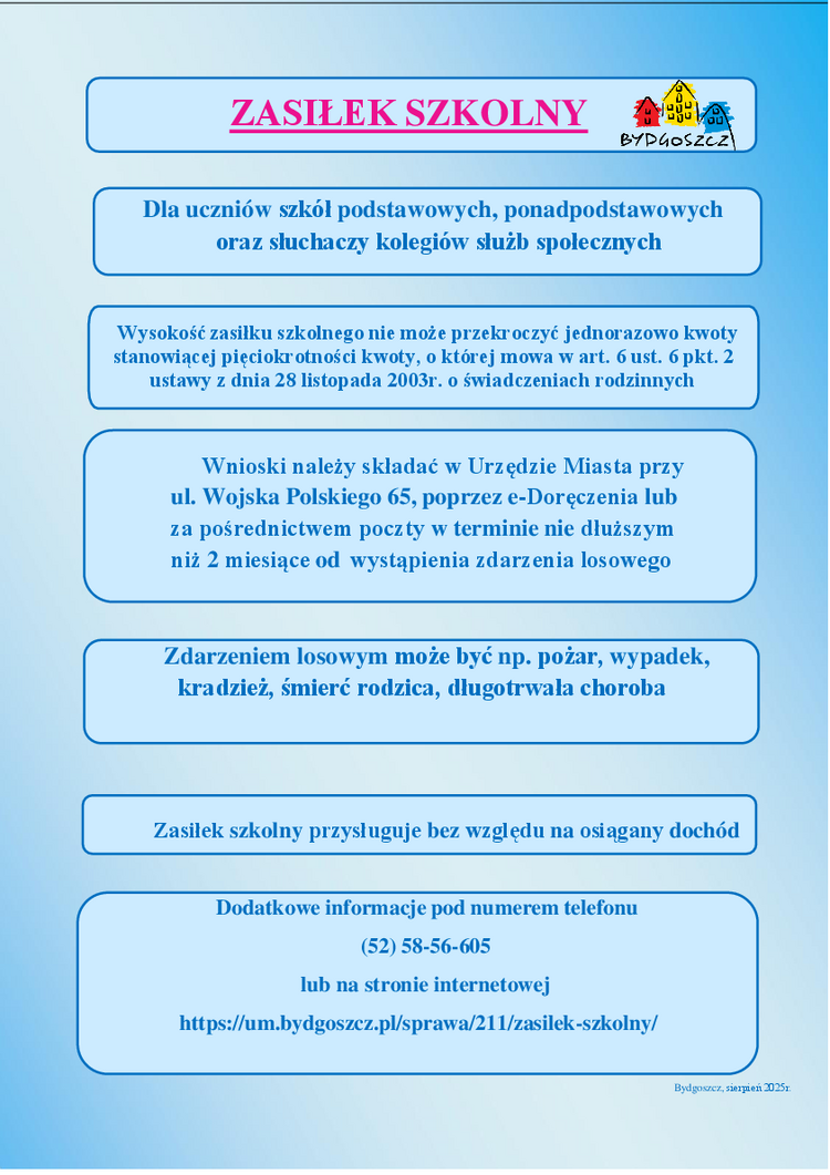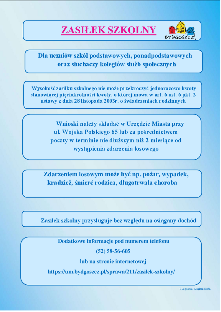 e-mail: wsr@um.bydgoszcz.pl tel. (52) 58 56 700, (52) 58 56 735 - pełny wykaz telefonów znajduje się na stronie www.bydgoszcz.pl/swiadczenia/o-nas/